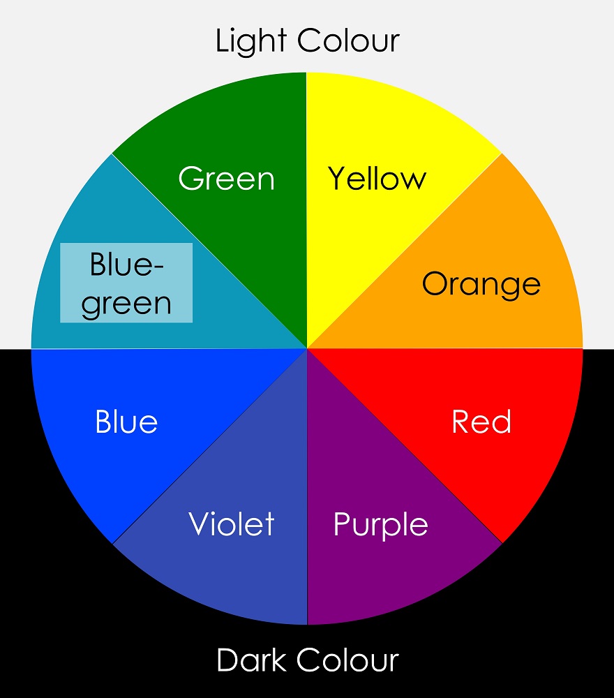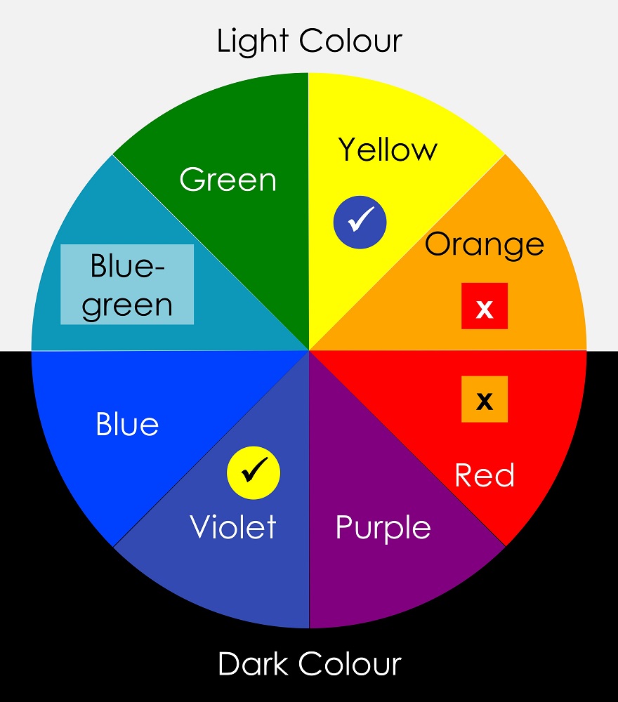 Dark colours from the bottom half of the hue circle contrasts best against light colours from the top half. Avoid viewing light colours from the bottom half against dark colours from the top half, see Figure #2. Lightness is the most important attribute in making contrast more effective.