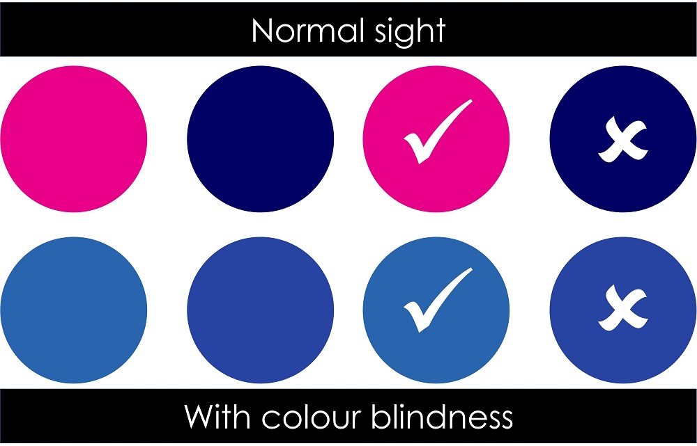 Workplace that is accessible and inclusive to the greatest extend can benefit people with or without special needs. How should we design the interior with the use of contrasting colours, added with shapes or symbols to assist employees’ with colour blindness to better do their job? Let’s see the picture below. By selecting pink and navy blue (first row), the colours become in-differentiable for people with colour blindness as shown in second row. However, by adding symbols to the shapes, the readability improved significantly.